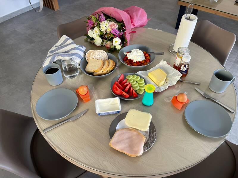 Ein Muttertag wie er im Buche steht! Gut und lange geschlafen, beim Aufwachen direkt den blauen Himmel vor der Balkontür gesehen und Kaffeeduft gerochen. Und tatsächlich hat mein Herzallerliebster nicht nur das Frühstück vorbereitet, nein, er war auch noch im Blumenladen und hat mir einen Strauß gekauft!! Ist das zu fassen... ich wusste nicht einmal, das es in Nea Peramos ein Blumengeschäft gibt!